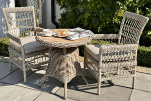 The Amalfi Collection Outdoor Bistro Table With Wood Top is a sophisticated addition to any outdoor space, combining modern functionality with natural charm. Its lightweight yet sturdy powder-coated aluminium frame ensures rustproof and corrosion-resistant durability, making it perfect for year-round use. The table is wrapped in chunky 12mm HDPE wicker weave, offering a realistic, hardwearing texture that enhances its contemporary design. Topped with a beautifully finished wooden surface, this table brings warmth and elegance to your garden, patio, or balcony.