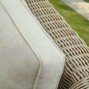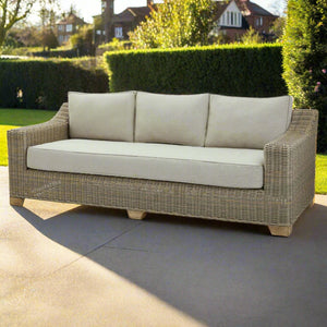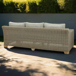 The Capri Collection Outdoor Three Seater Sofa is a perfect blend of timeless style and exceptional durability, designed to elevate your outdoor living space. With its generous proportions and contemporary design, this sofa provides ample seating for relaxing or entertaining guests. The neutral beige tones of the 5mm half-round HDPE wicker weave create a sophisticated look that complements various outdoor aesthetics, from modern patios to cosy garden settings.