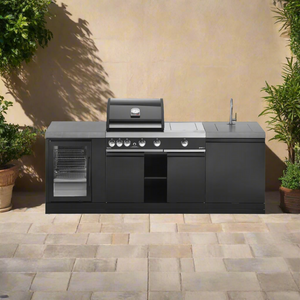 The Grand Pro 230cm Series Premium G4 Outdoor Kitchen is a versatile and high-end outdoor cooking station designed for those who demand both functionality and style. At the core of this kitchen setup is the Grandhall Premium G4 Plus Built-In Gas BBQ, featuring four powerful stainless steel burners, a rear infrared burner for slow cooking and searing, and a handy side burner for sauces and side dishes. The double-layered hood provides excellent heat retention, ensuring perfectly cooked meals every time. The electronic ignition system offers a quick and effortless start-up, while the built-in thermometer allows you to monitor cooking temperatures with precision.