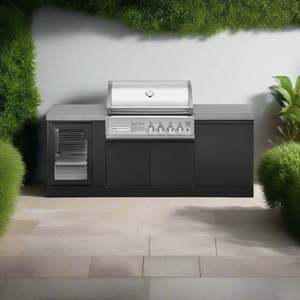 Step up your outdoor entertaining with the Grand Pro 272cm Series Crossray 4 Burner Modular Outdoor Kitchen, designed to bring people together while delivering exceptional grilling performance. This thoughtfully designed kitchen keeps you at the heart of the party, allowing you to prepare meals outdoors without being confined to an indoor kitchen. Featuring the Crossray 4 Burner Built-In Gas BBQ, a double-door BBQ cabinet, a fridge unit, and a double-door side cabinet, this outdoor kitchen provides ample cooking, prep, and storage space to enhance your outdoor living experience.