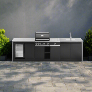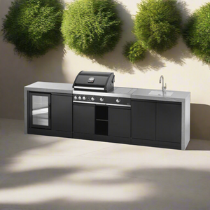 Transform your outdoor space into a fully functional culinary paradise with the GrandPro 299cm Premium G4 Modular Outdoor Kitchen with Fridge & Sink – Waterfall Edition. Designed to combine high-end aesthetics with professional-grade performance, this modular kitchen features the Grandhall Premium G4 Plus Built-In Gas Grill, an integrated refrigerator, and a stainless steel sink – all complemented by a stunning waterfall-edge countertop. Whether you're hosting a gathering or enjoying a family meal, this versatile and stylish outdoor kitchen provides everything you need in one seamless setup.