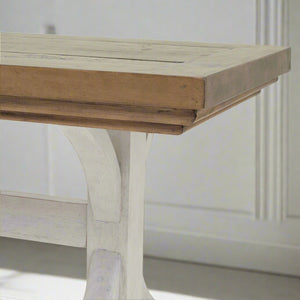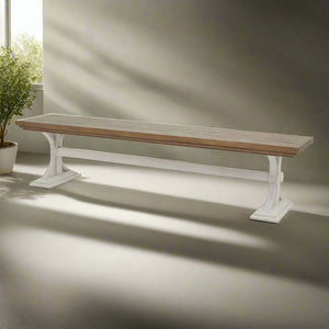 The Luna Collection Dining Bench is a stunning blend of rustic character and modern sophistication, making it a perfect addition to any dining space. Its off-white painted legs provide a fresh, contemporary contrast to the warm, mid-tone stained wooden top. The handcrafted planked pine design adds an earthy texture that highlights the natural beauty of the wood, creating a timeless aesthetic that complements a variety of interior styles.