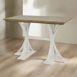 The Luna Collection Rectangular Bar Table is a sophisticated fusion of rustic charm and contemporary design. Featuring an off-white painted base and a warm, mid-tone stained wooden top, this bar table adds timeless appeal to any setting. The unique planked pine design, handcrafted by skilled artisans, showcases the natural beauty of the wood while providing a refined yet earthy texture. Its elegant combination of materials ensures it fits seamlessly into both classic and modern interiors.